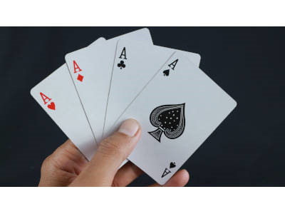 Playing cards aces and falling golden coin and poker chips
